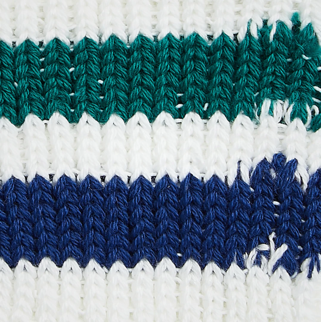 A low gauge knit sock in a cotton/linen blend, blue and green stripes, and a light tan accent on the toe and heel