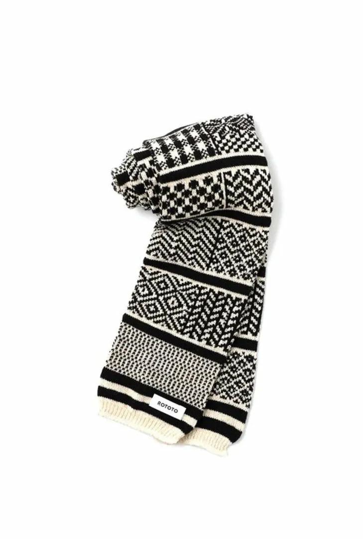 A long narrow knit scarf in an ivory & black multi jacquard. Comes in a clear Rototo branded zip case.