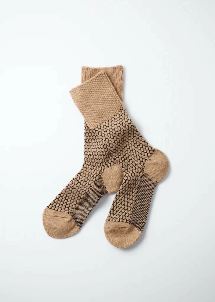 A super soft mid weight wool sock with a knit-in pattern using a different finer thread for the pattern, giving the sock an uneven “pop corn” texture