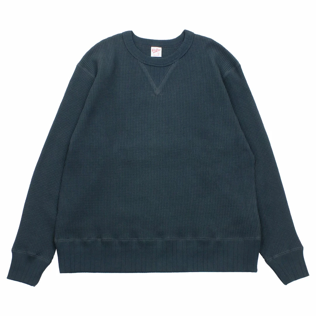 A soft brushed thermal crewneck sweatshirt with a variable width ribbed collar, cuffs, and bottom hem. V-gusset at front neck.