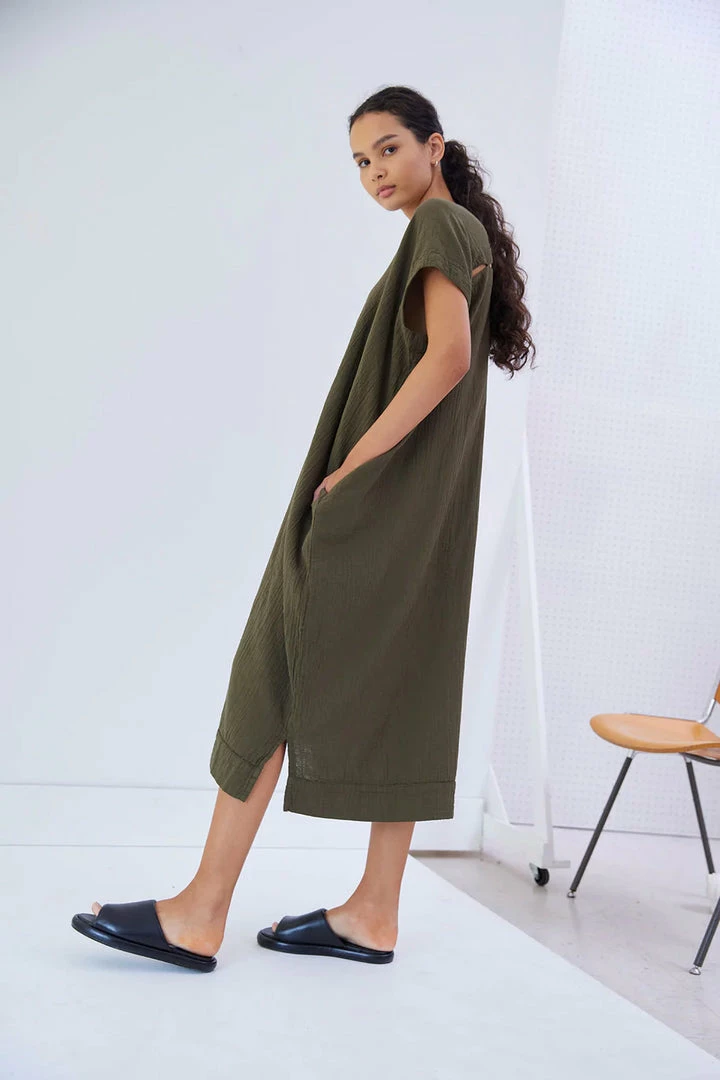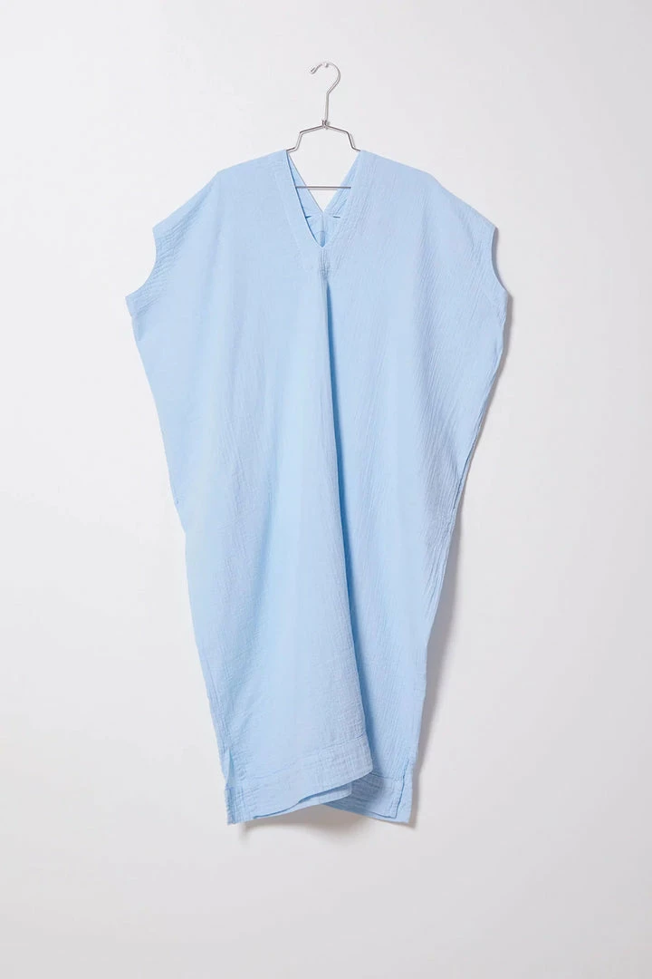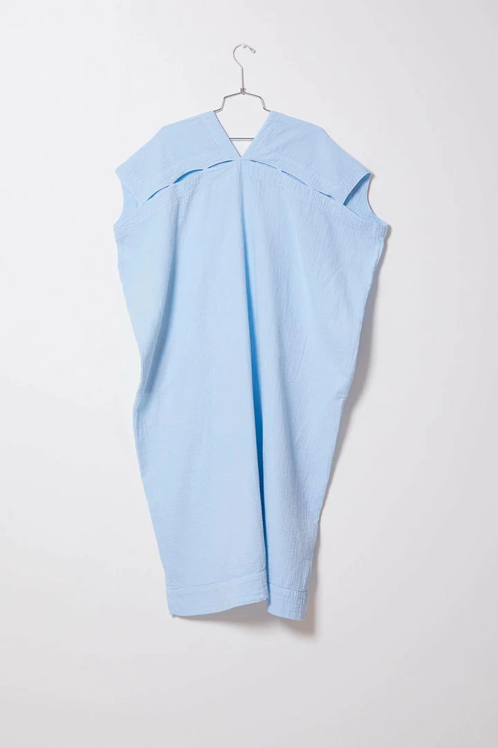 Atelier Delphines signature piece the Crescent Dress in a slightly longer length, in a new seasonal color of ballad blue, lightweight crinkle cotton Japanese fabric