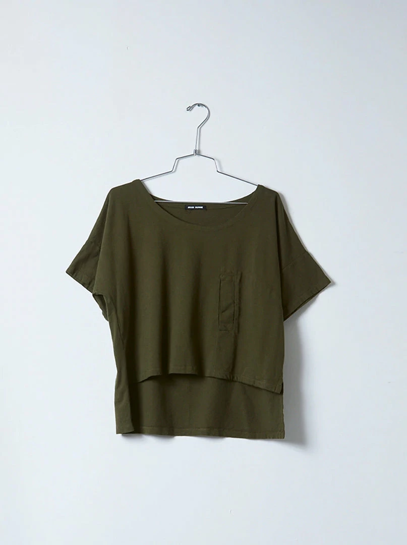 Oversized short sleeve pocket tee with a side entry pocket, slouchy boxy fit with side hem slits and a longer back hemΒ