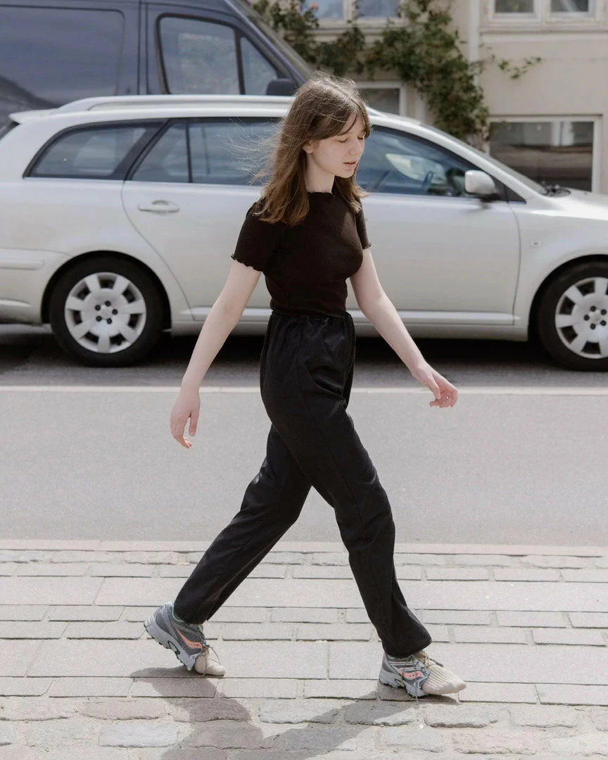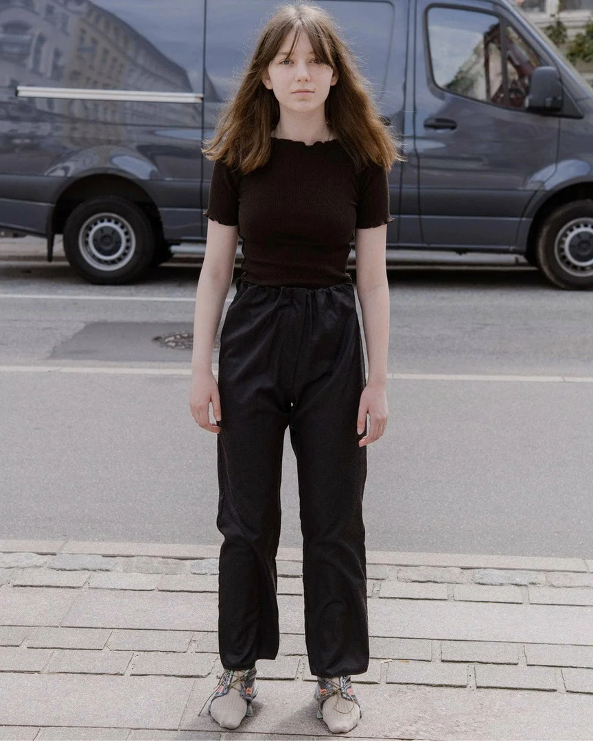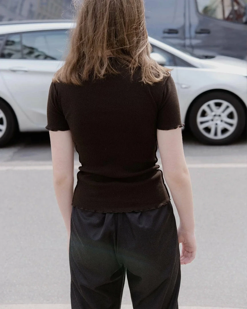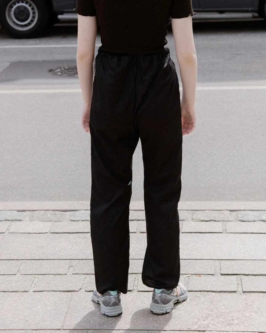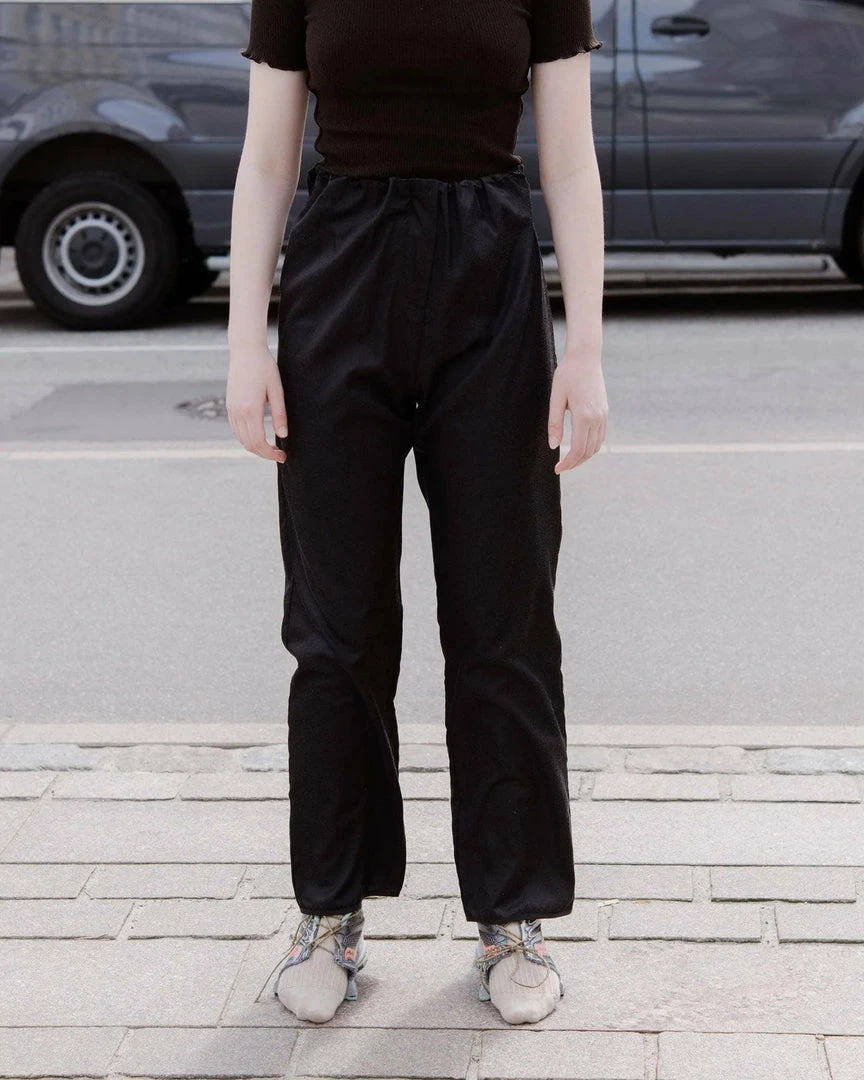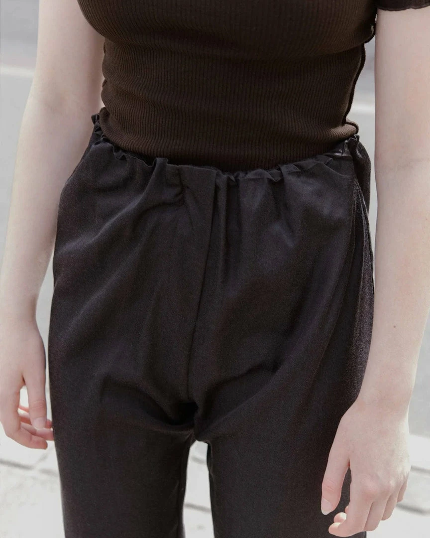 A comfortable smooth and sleek elastic waist pant in a deep dark brown/black