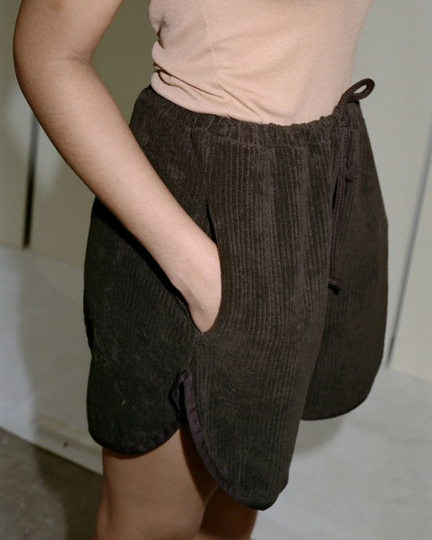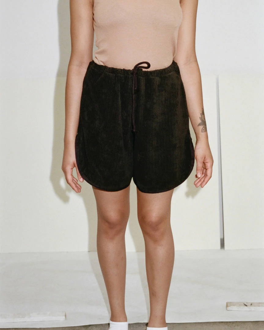 A vertical rib terry fleece short with a wide waist and drawstring that cinches them to give them a pretty shape, curved bottom hem, 2 hand pocket