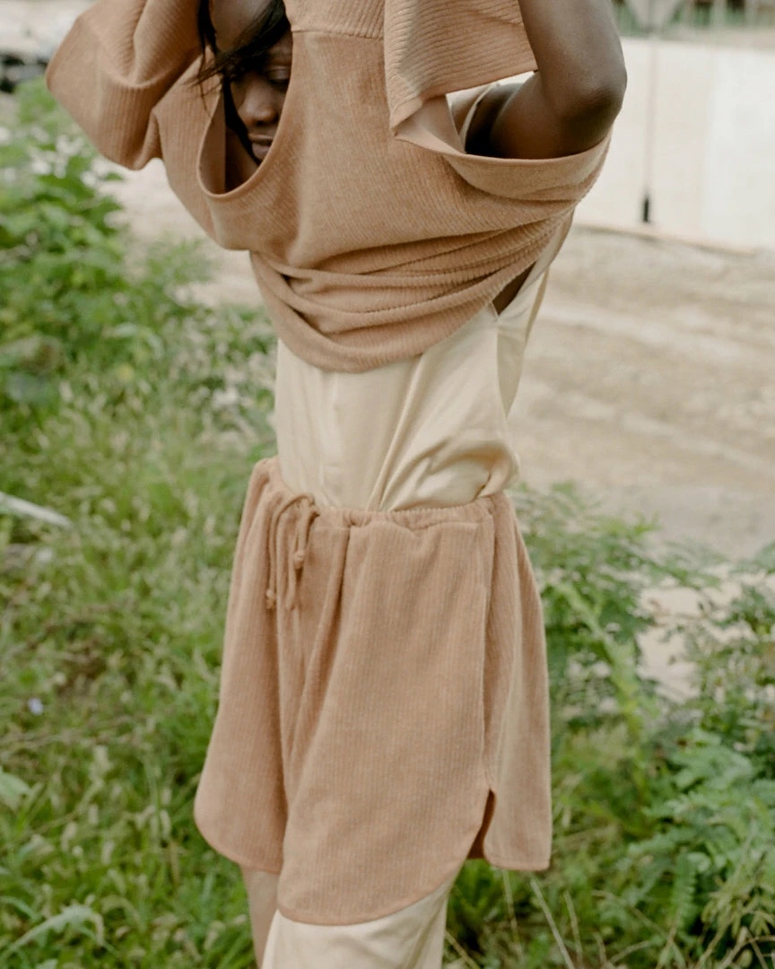 A relaxed fit terry fleece rib shorts with a wide waist and drawstring closure, attractive curved bottom hem with contrast texture fabric. Side seam pockets.