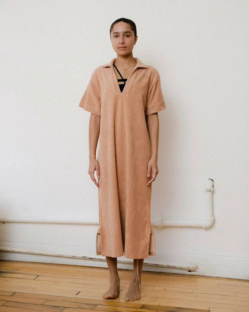 A cotton terry fleece rib short sleeve dress with a V-neck and collar, comfortable relaxed fit, bottom side seam slits for mobilityΒ