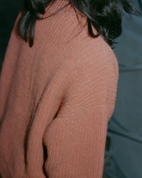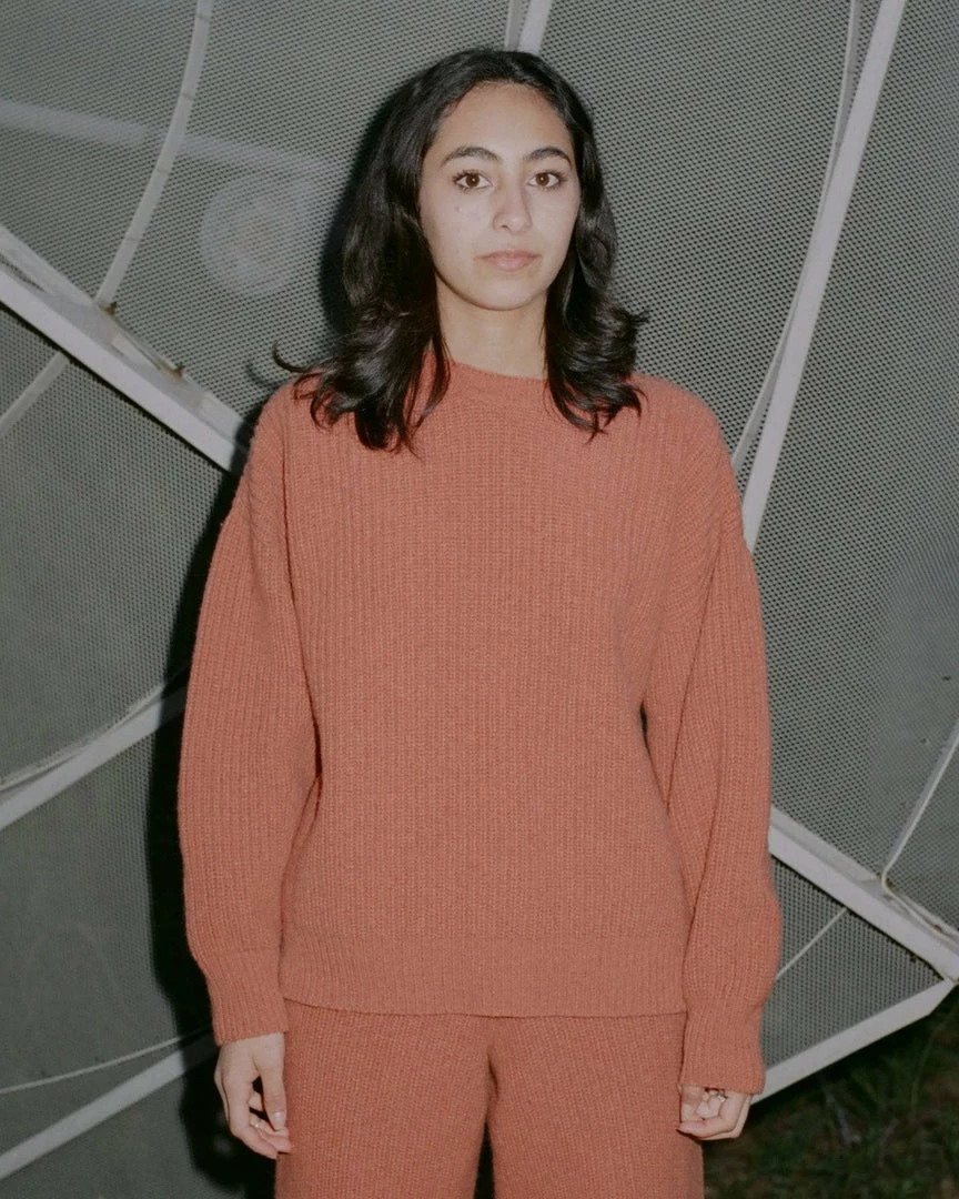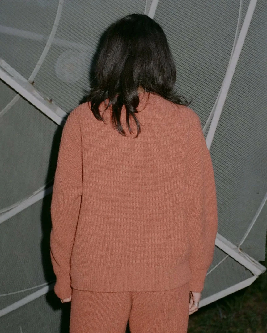 A continued easy fit pullover in a new recycled wool in the color of “shail red”Β