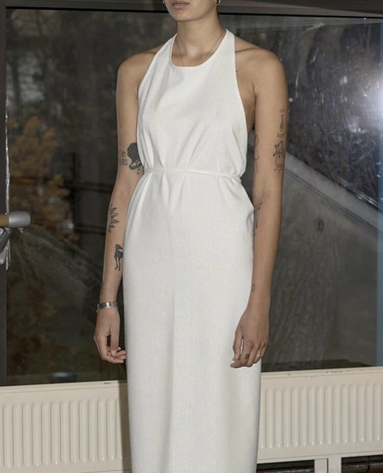 An easy wraparound & tie raw silk apron dress that can be worn by itself or over a number of styles of shirts, making this dress an elegant yet simple year round piece.