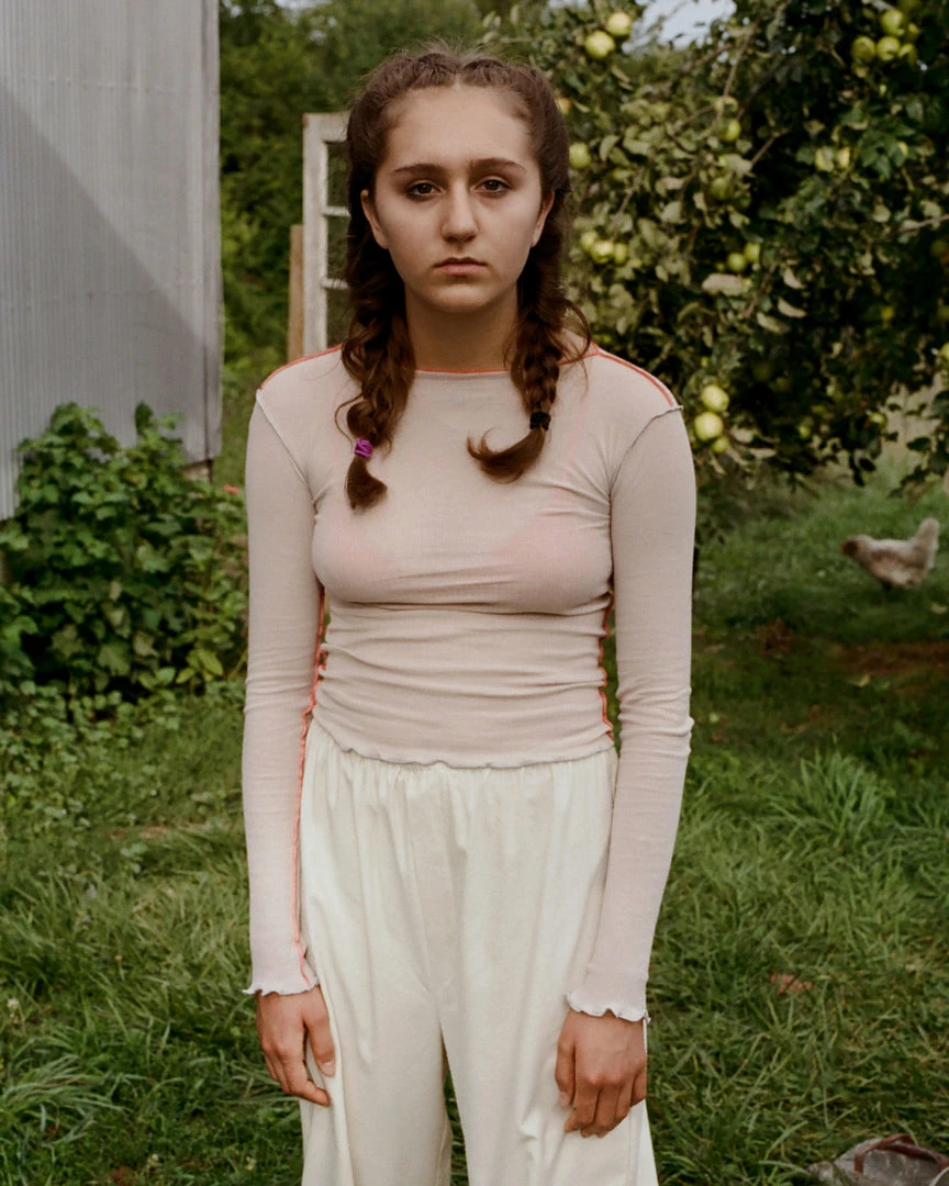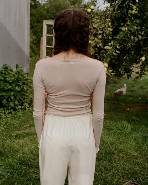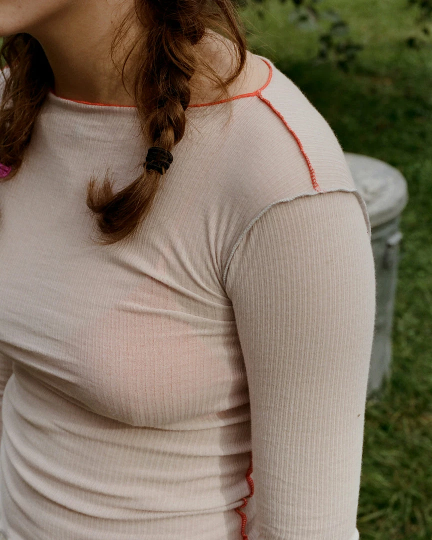 A stretchy fitted long sleeve with a vertical rib and contrast exposed seam details