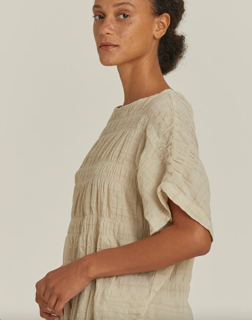 A relaxed fit top with an intricate woven texture