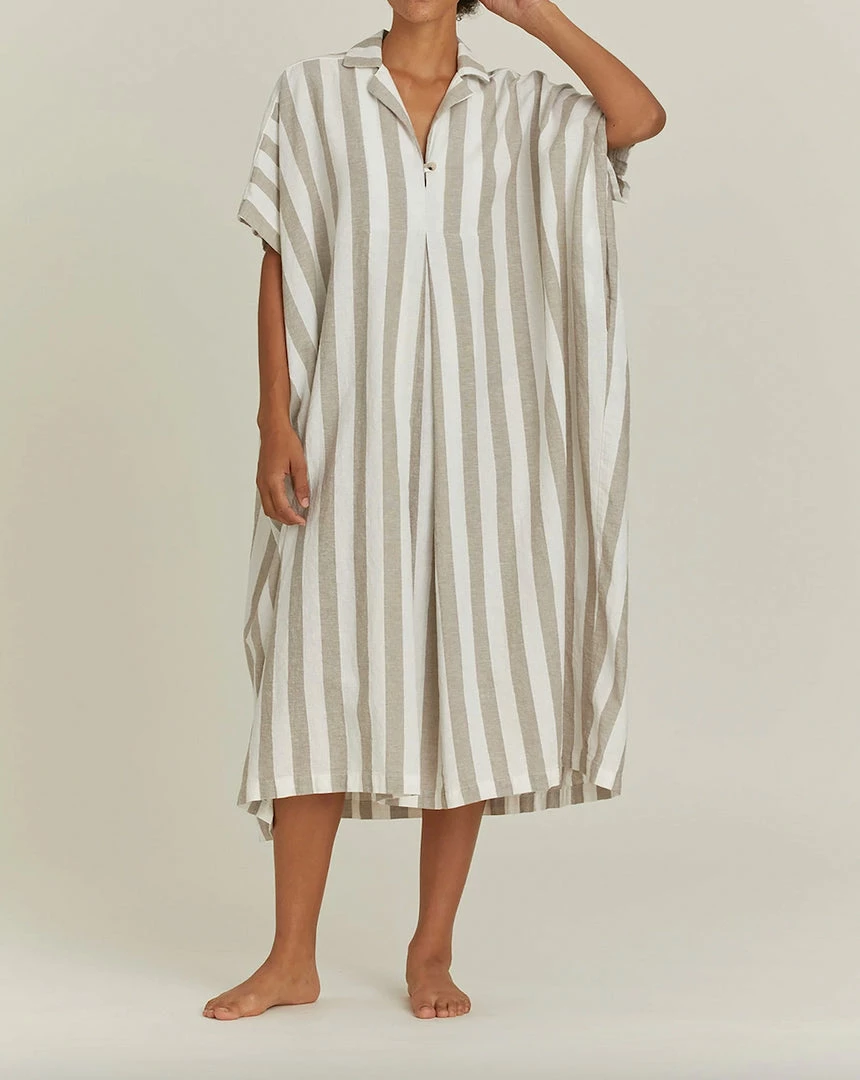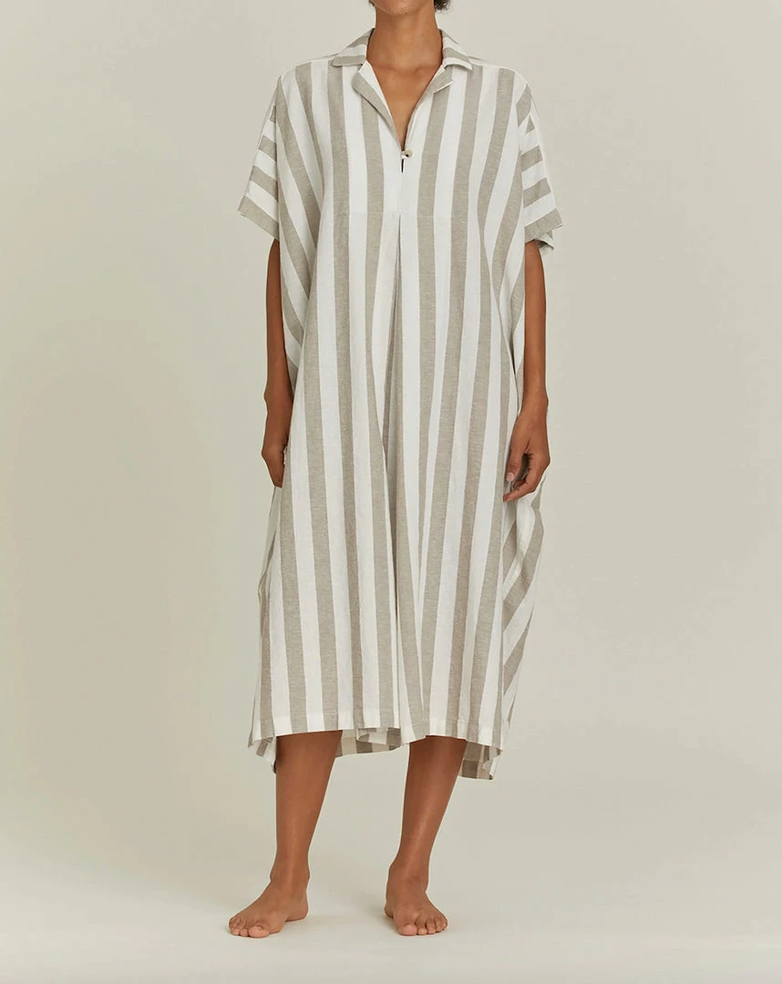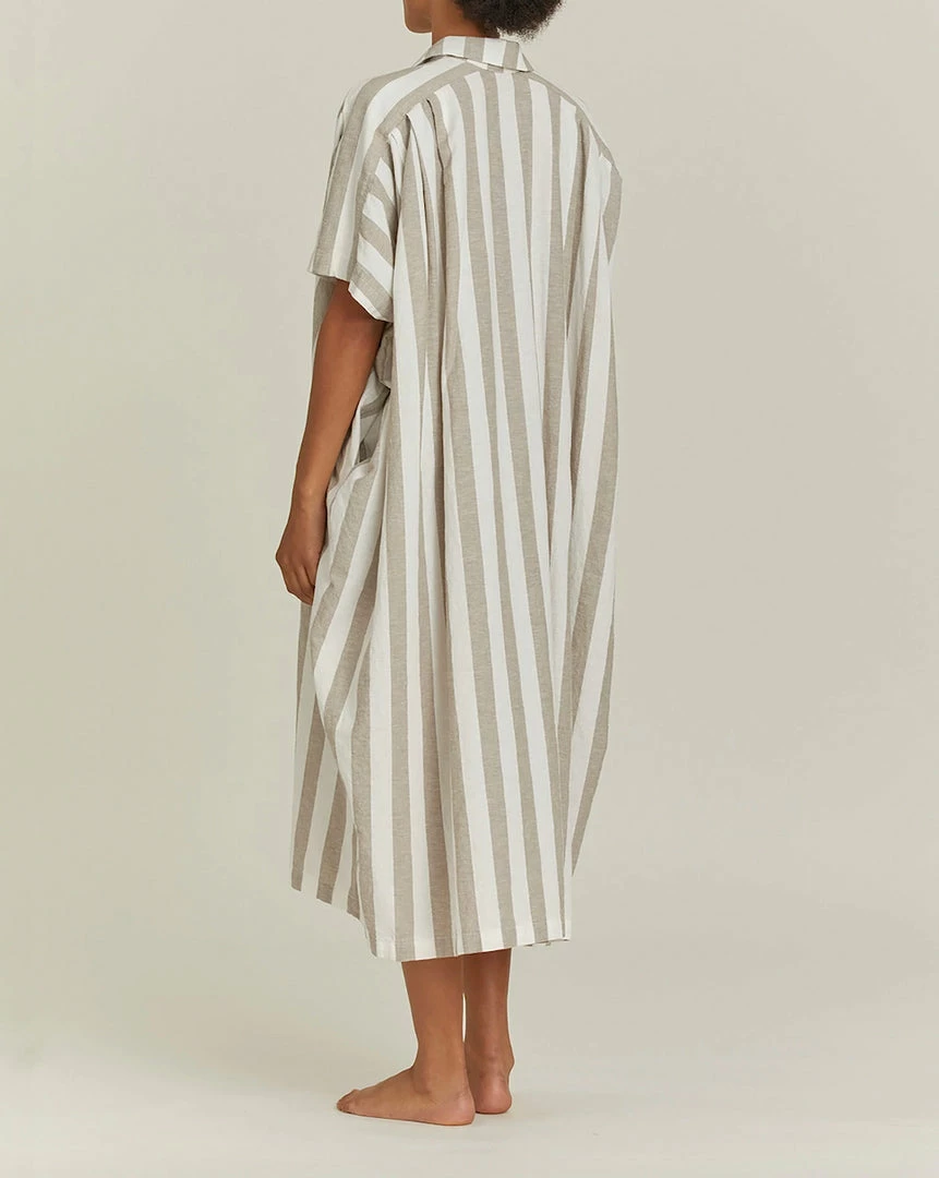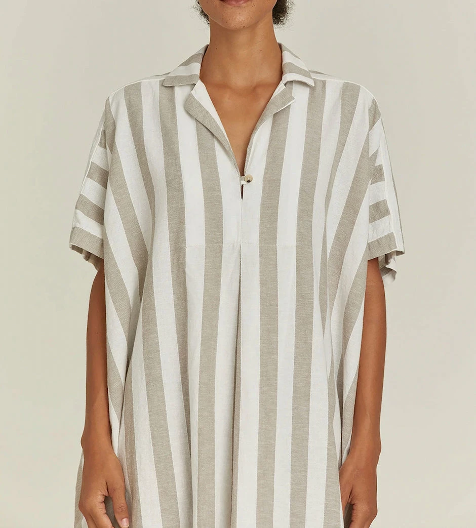A relaxed fit boxy dress, pointed collar with button detail, inverted front pleat, back creased pleats, and side pockets