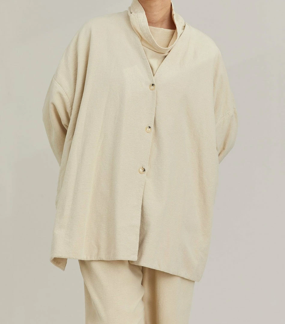 A relaxed fit boxy heavy flannel jacket, drop shoulder, double layered button front, side seam pockets