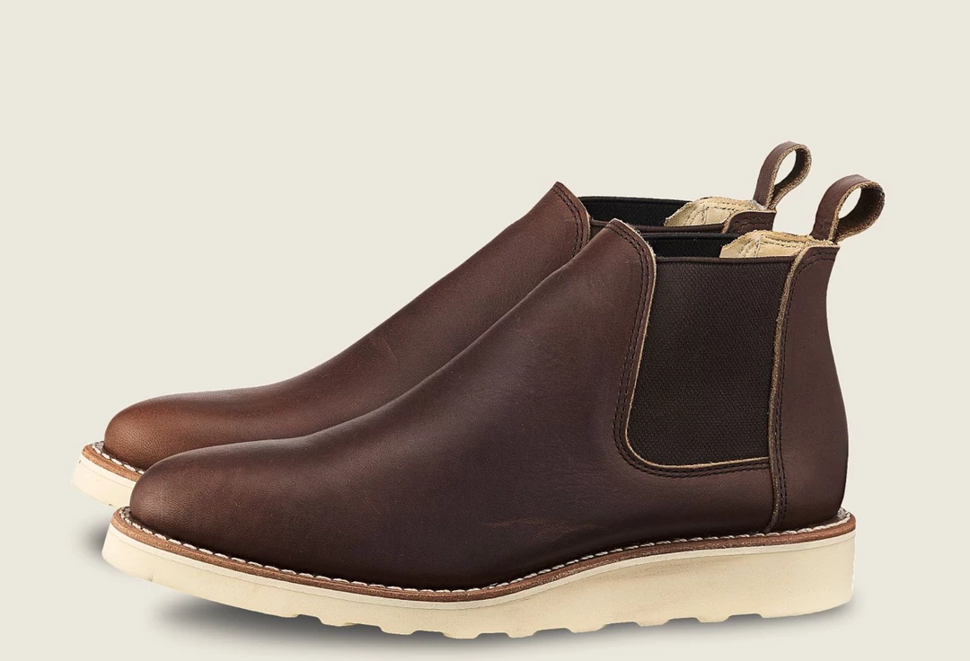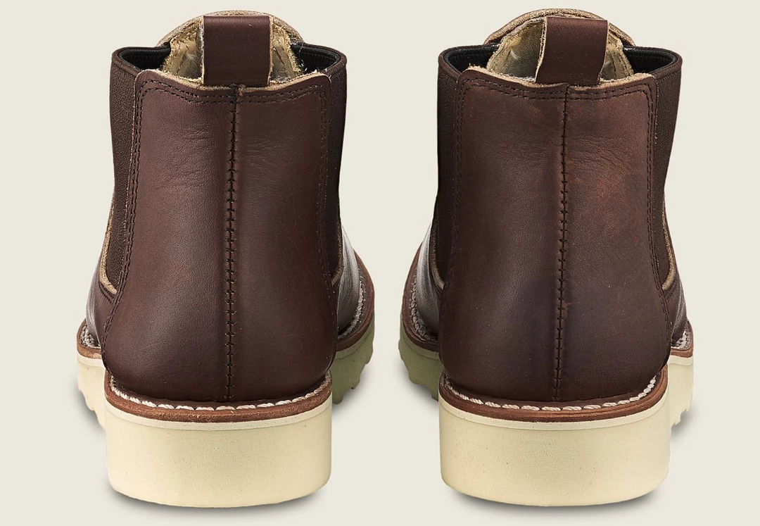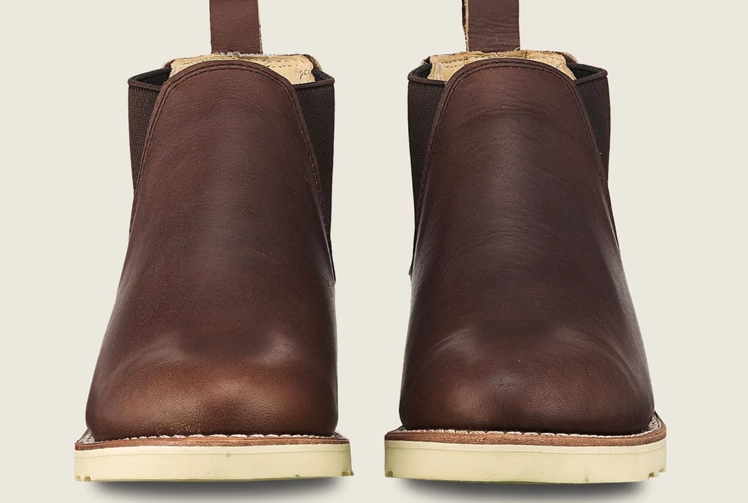 A Red Wing Chelsea boot with flexible side goring for a comfortable slip-on entry, leather upper, traction tread sole with a Goodyear welt construction.