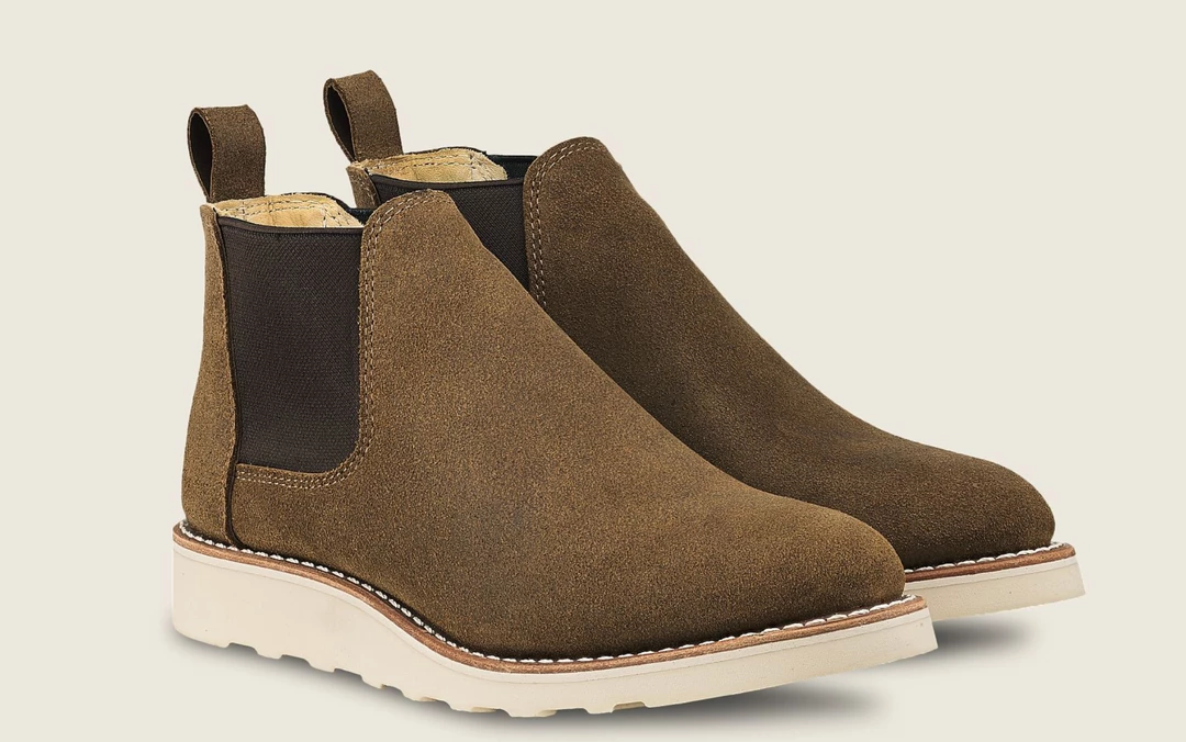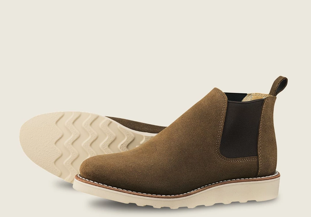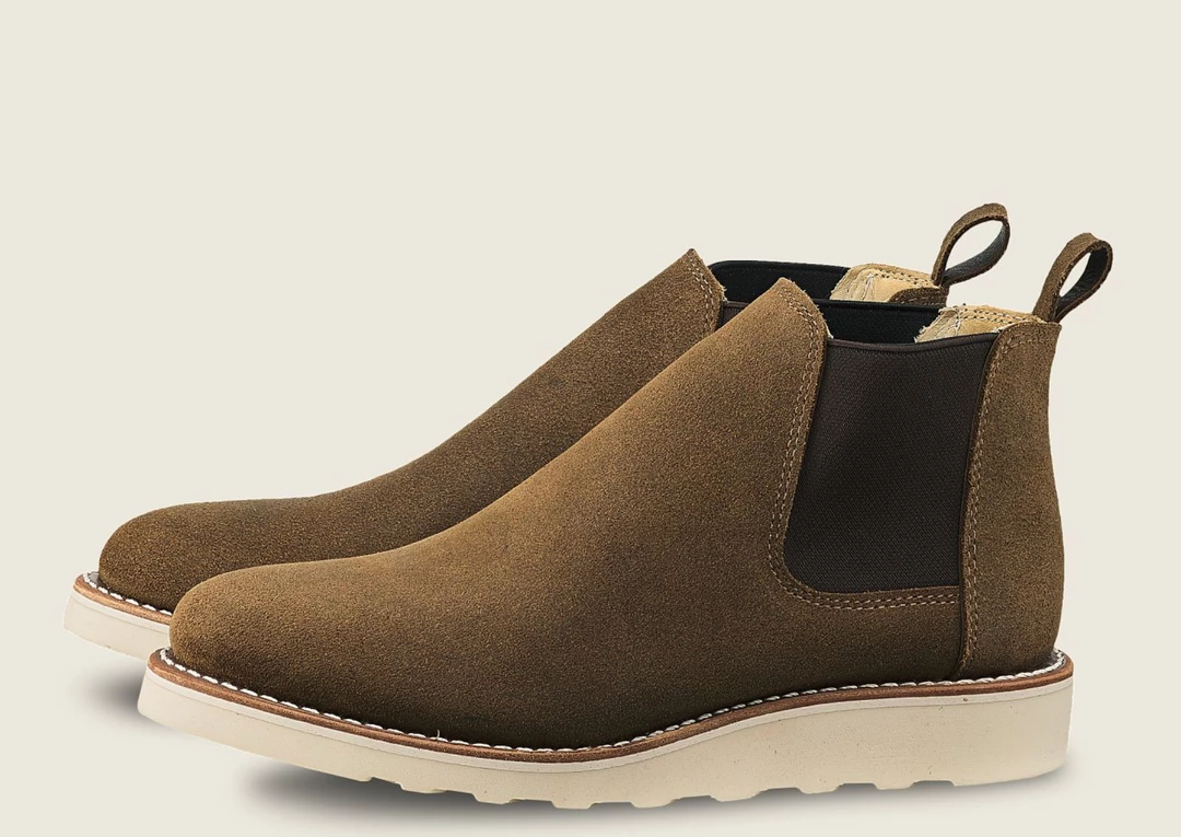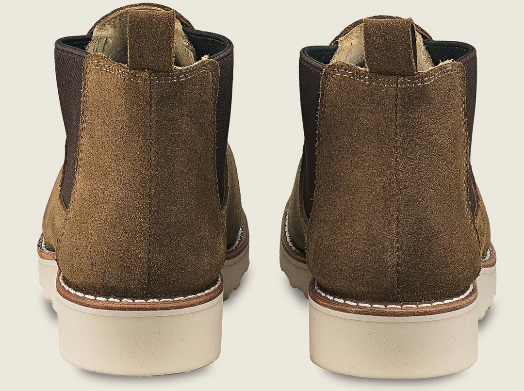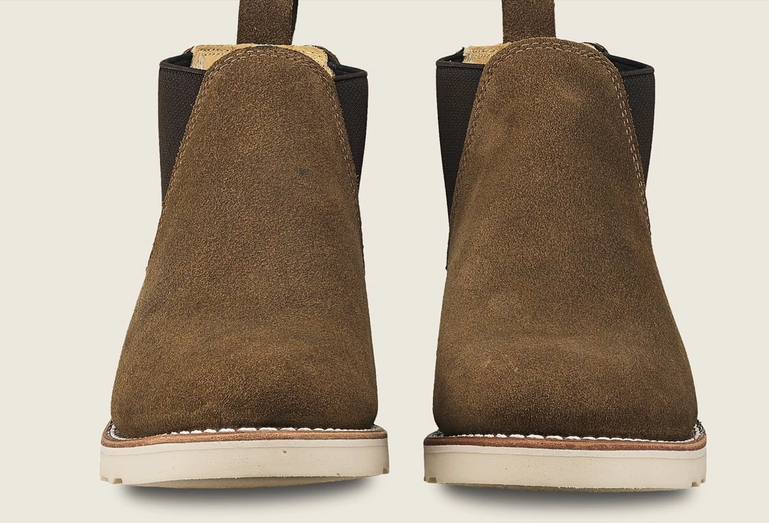 A Red Wing slip-on Chelsea boot with a traction tread rubber sole, flexible side goring, and Goodyear welt construction so these can be re-soled. The Clove Acampo is a “rough-out” leather, smooth side on the inside. Rough-out leather is just as tough as all smooth-out Red Wing leather, and ages with a lot of character.Β