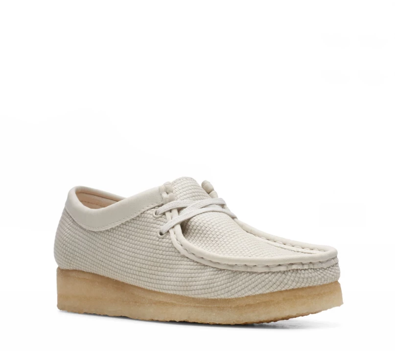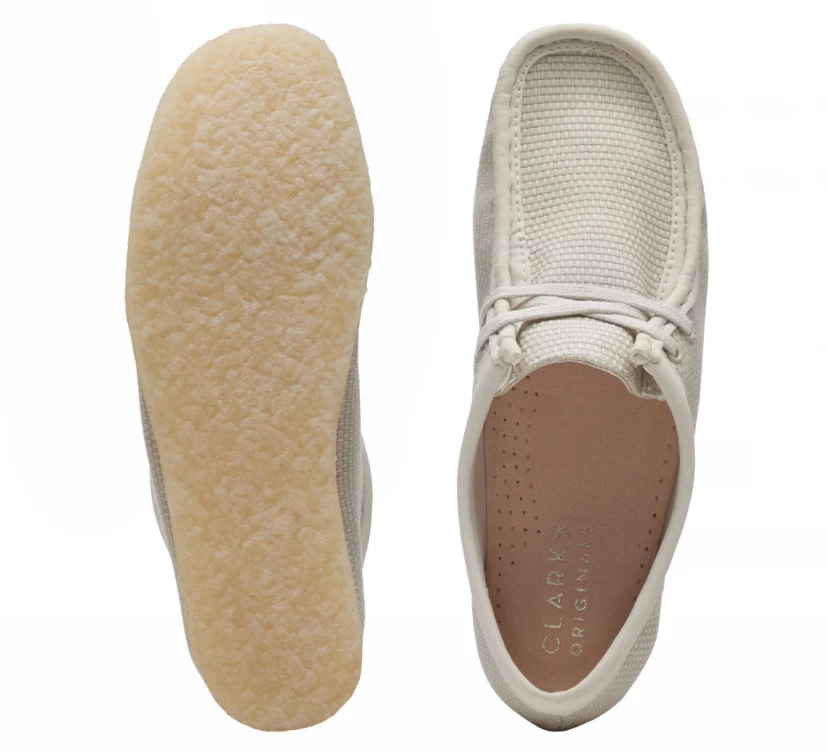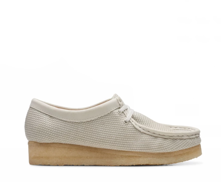 The classic Wallabee by Clarks Originals in a special textile & leather upper, natural crepe sole