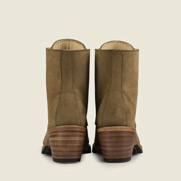 Rough-out leather, 2.25β stacked leather heeled boot with a Vibram outsole, Goodyear welt re-soleable sole, nickel eyelets, steel shank in sole, built to last. Rough-out leather is leather with the rough side facing out. It is strong and does not dirty or scuff like what most people think traditional suede will do. These are made to be worn and beaten in, and will only look better the more you do so.