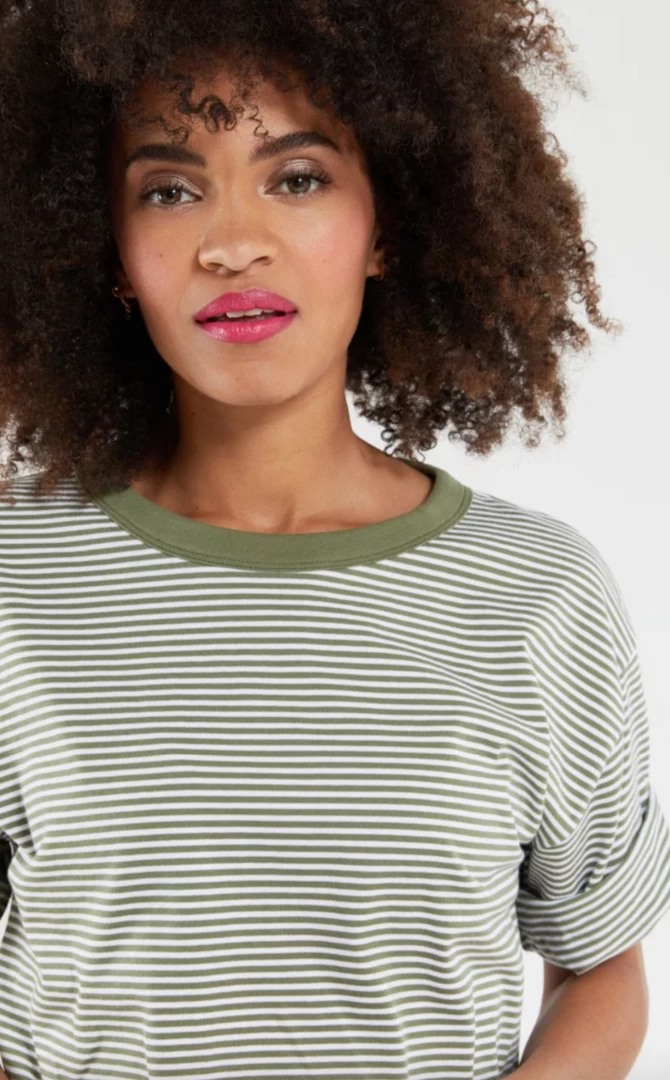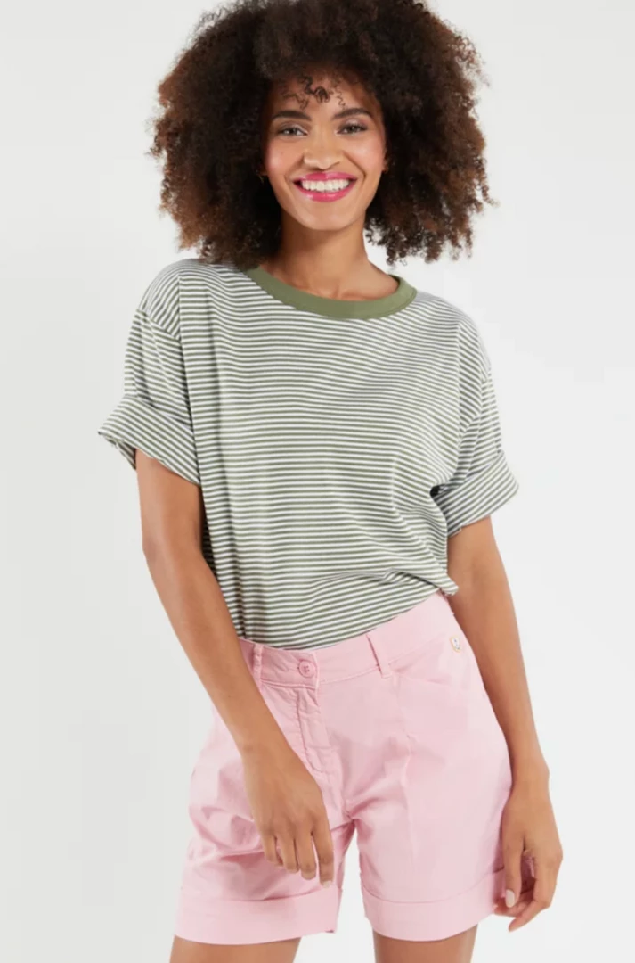 A fine stripe women’s boxy tee with a drop shoulder and elbow length sleeves in the color a seasonal color of blanc/military. Armor Lux anchor logo patch at bottom left hem.