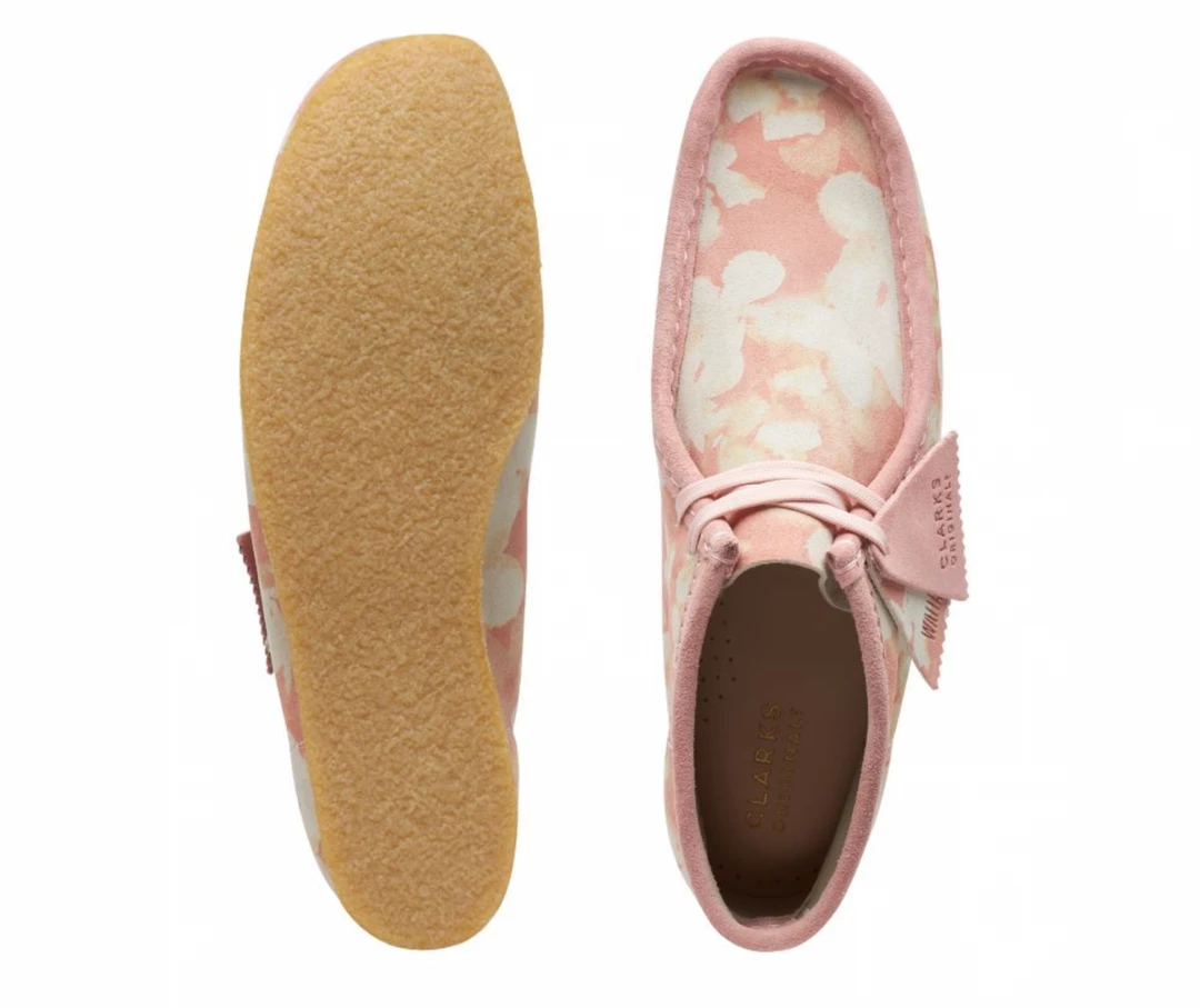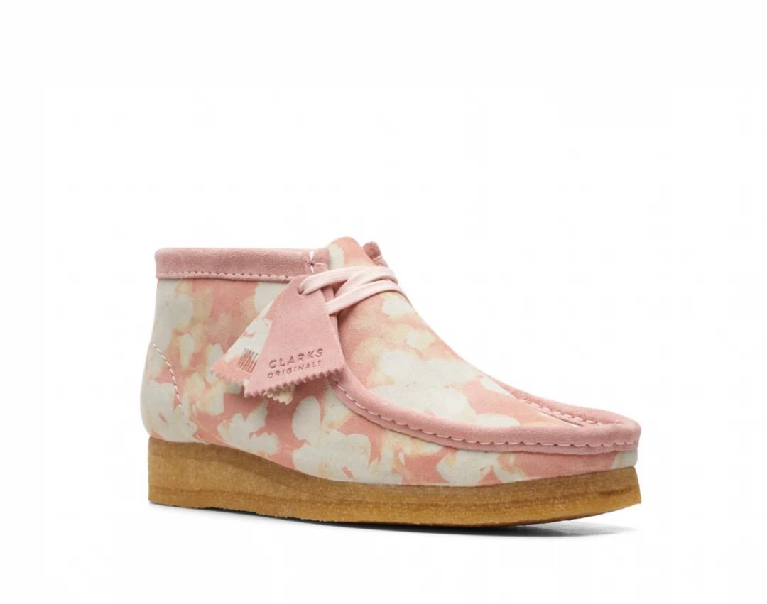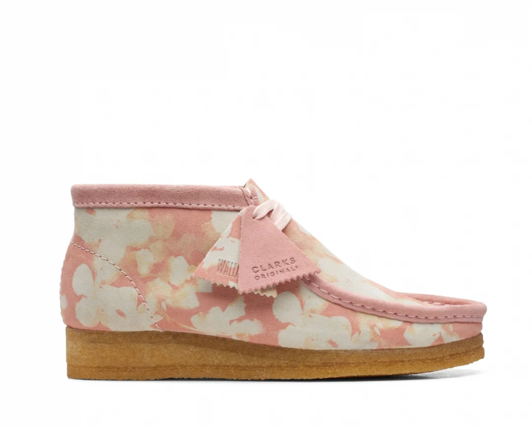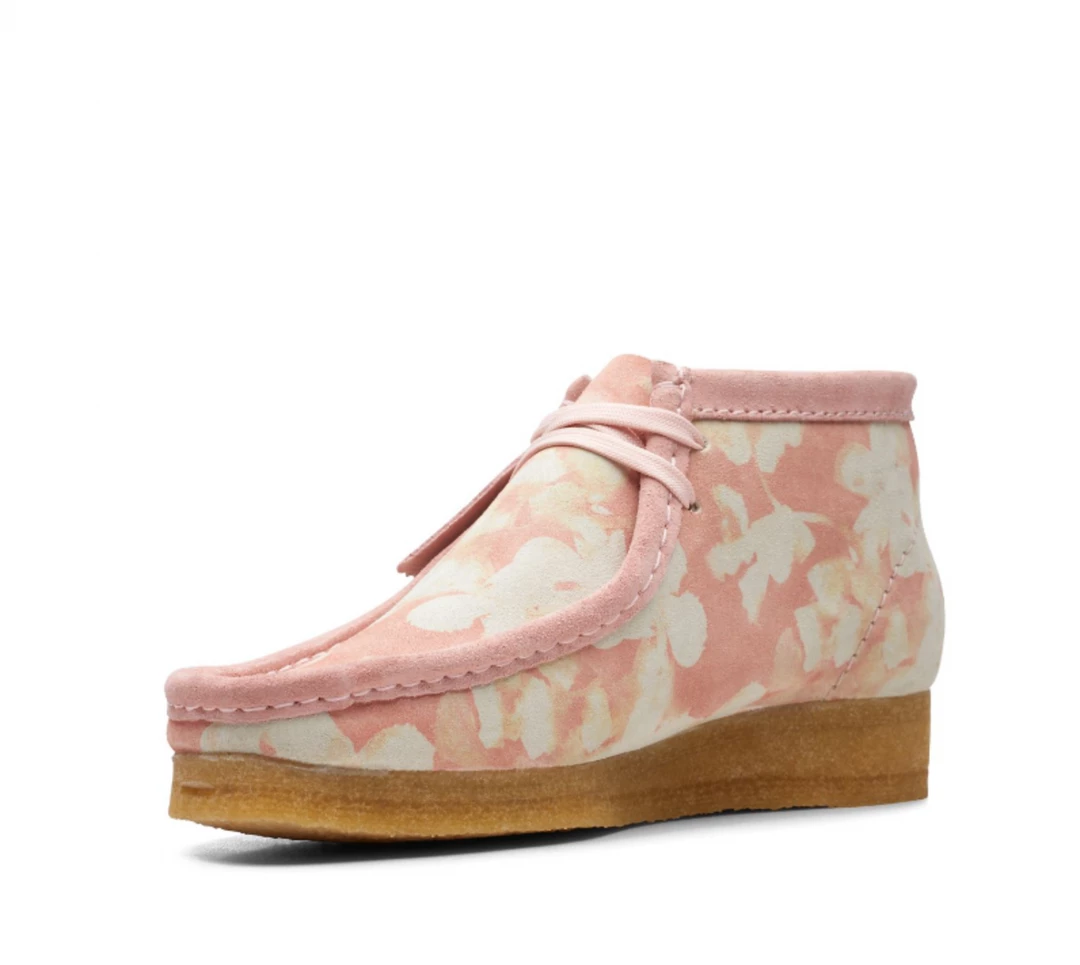 The iconic Clark’s Originals Wallabee boot in a premium pink floral print upper suede, and classic crepe sole.