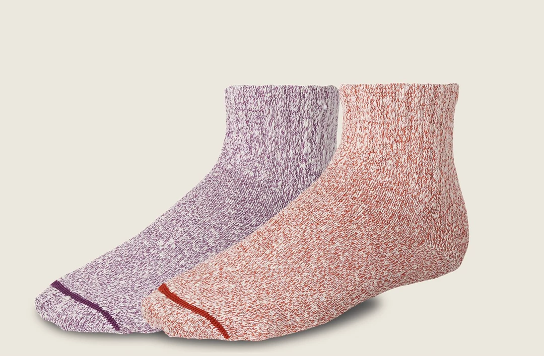 A slub cotton yarn twisted to create a unique texture, flat knit construction, flat toe seam, ribbed upper and cuff.Β
