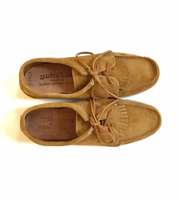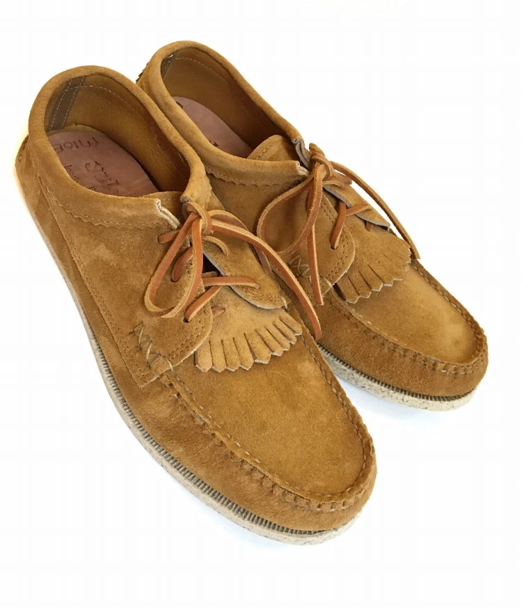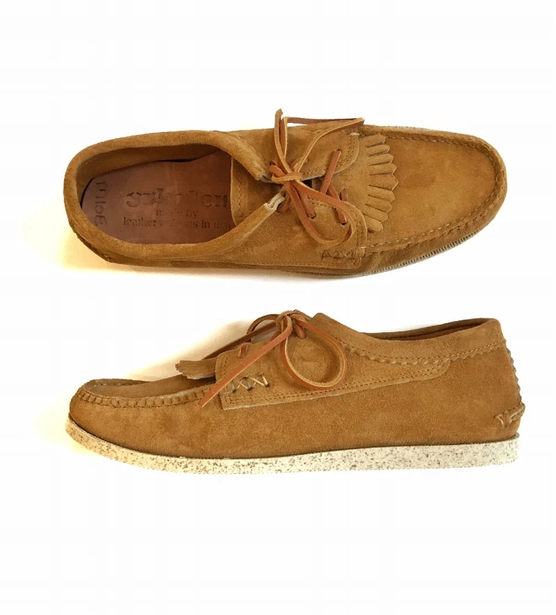 Suede upper in a vibrant “Grappa” color that matches the white speckled natural rubber camp sole. Vegetable tanned leather
