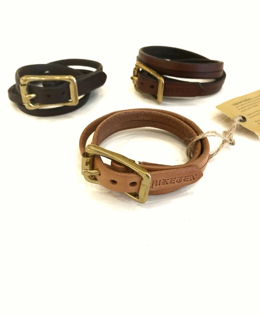 A double wrap leather bracelet, split lengthwise, with an adjustable brass buckle, branded-in Yuketen lettersΒ