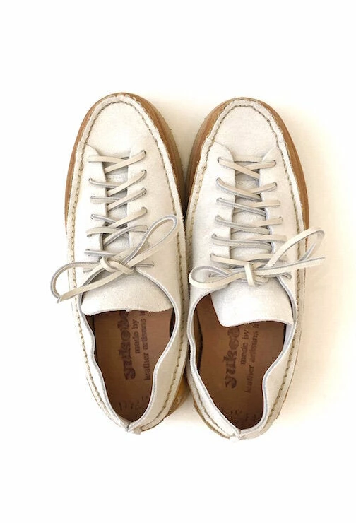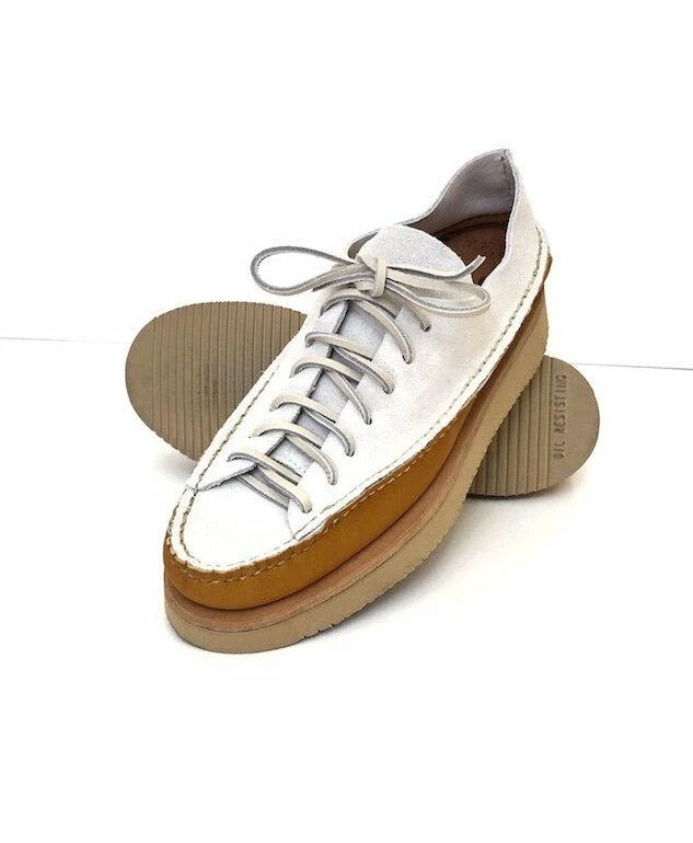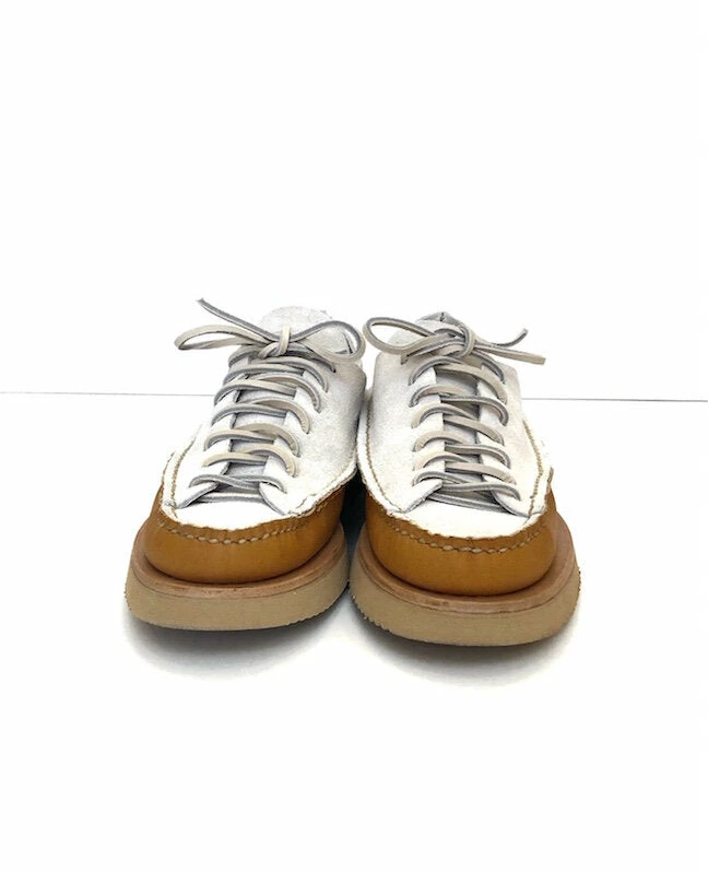 An all handsewn shoe by Yuketen, with a white suede & tan leather upper, white leather laces, thick oil-resistant Vibram rubber sole